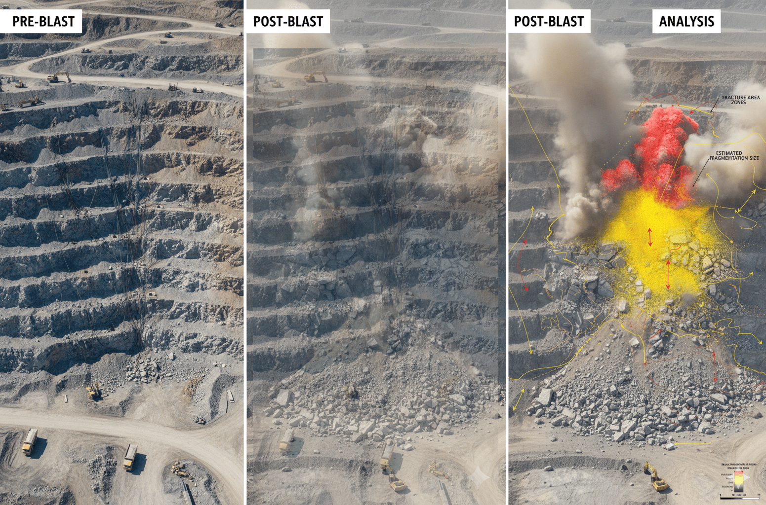Drone-based blast monitoring enables accurate and objective assessment of blasting operations in mining and quarrying environments. By capturing high-resolution aerial data before and after blasting events, drones provide precise evaluation of blast effectiveness, fragmentation quality, and material displacement. In addition, aerial monitoring of dust and debris dispersion supports operational safety and ensures compliance with environmental regulations. This data-driven approach helps optimize blast design, reduce secondary blasting, minimize environmental impact, and enhance overall operational efficiency.