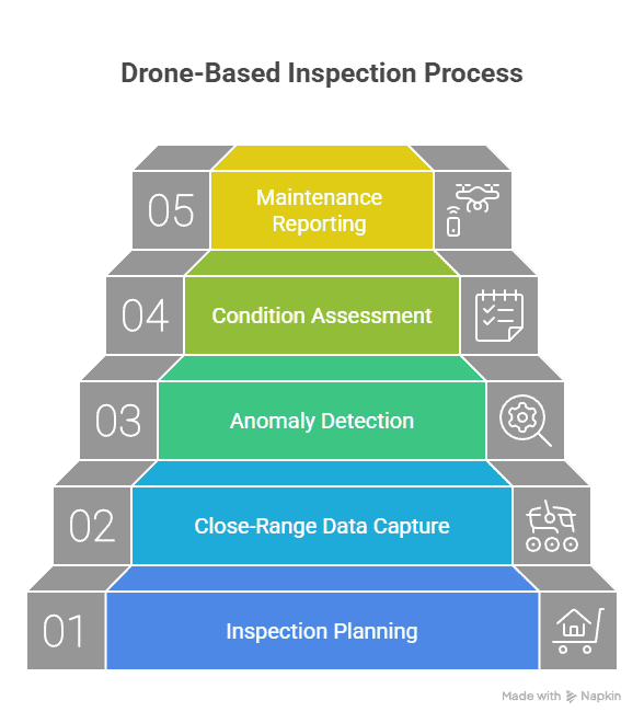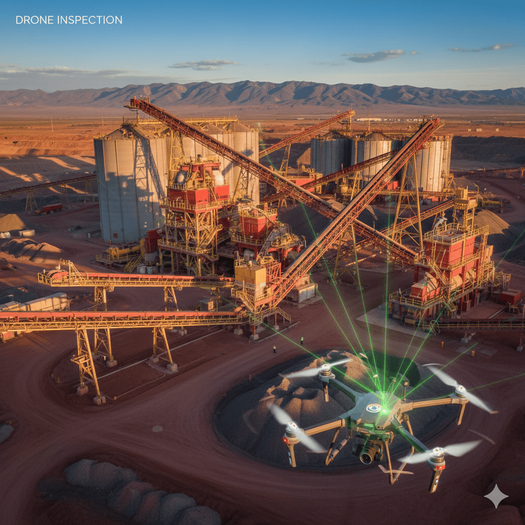 Drone-based equipment and infrastructure inspection enables safe, rapid, and detailed assessment of mining machinery and processing facilities. High-resolution visual and thermal imagery allows operators to inspect conveyors, crushers, transfer points, silos, and plant structures without halting operations or exposing personnel to hazardous environments. Early detection of wear, overheating, misalignment, or structural damage helps prevent unplanned shutdowns, reduces maintenance costs, and extends equipment life. By integrating drone data into maintenance planning, mining operators can transition from reactive repairs to proactive, condition-based maintenance strategies.