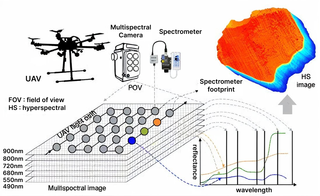 This image represents the working process of our drone equipped with a multispectral camera. As the drone flies over the target field, the multispectral camera captures images at different wavelength bands such as 490 nm, 550 nm, 680 nm, 720 nm, 800 nm, and 900 nm. These images help record the light reflectance from crops and soil in various spectral ranges. At the same time, the spectrometer collects detailed reflectance data from a specific area to maintain radiometric accuracy and ensure reliable calibration. The captured data layers are then combined to generate a image, which provides information on crop health, nutrient levels, and stress conditions. This process enables Drishti drone to deliver accurate, data-driven insights for precision agriculture and field monitoring.