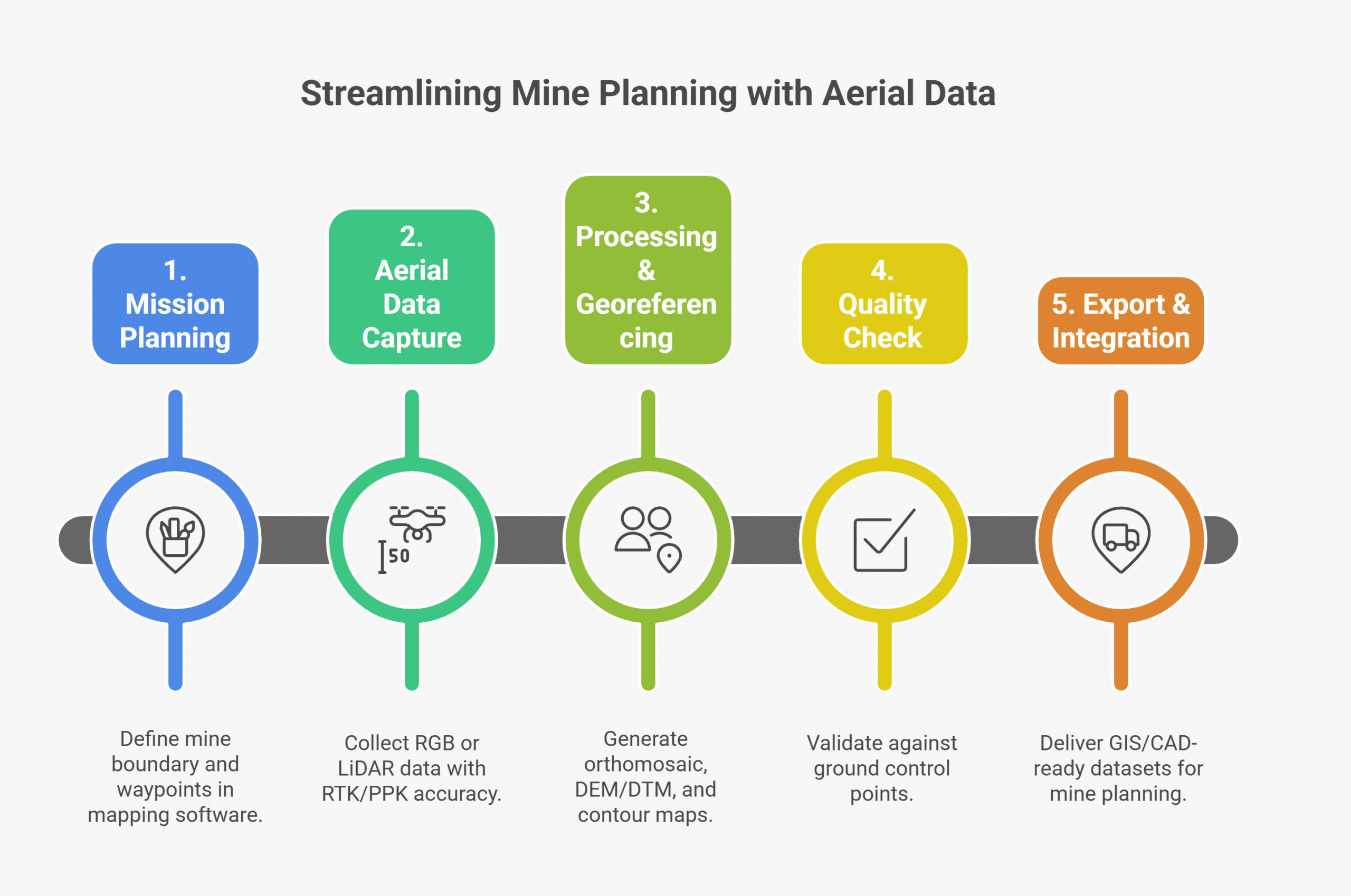 Drone site surveying replaces slow, hazardous ground surveys with rapid, high-accuracy aerial mapping. By capturing overlapping imagery and GNSS-referenced data, drones deliver centimeter-level terrain information used for planning haul roads, pit design, and infrastructure layout. This approach drastically cuts survey time, increases worker safety, and provides repeatable datasets for operational tracking.