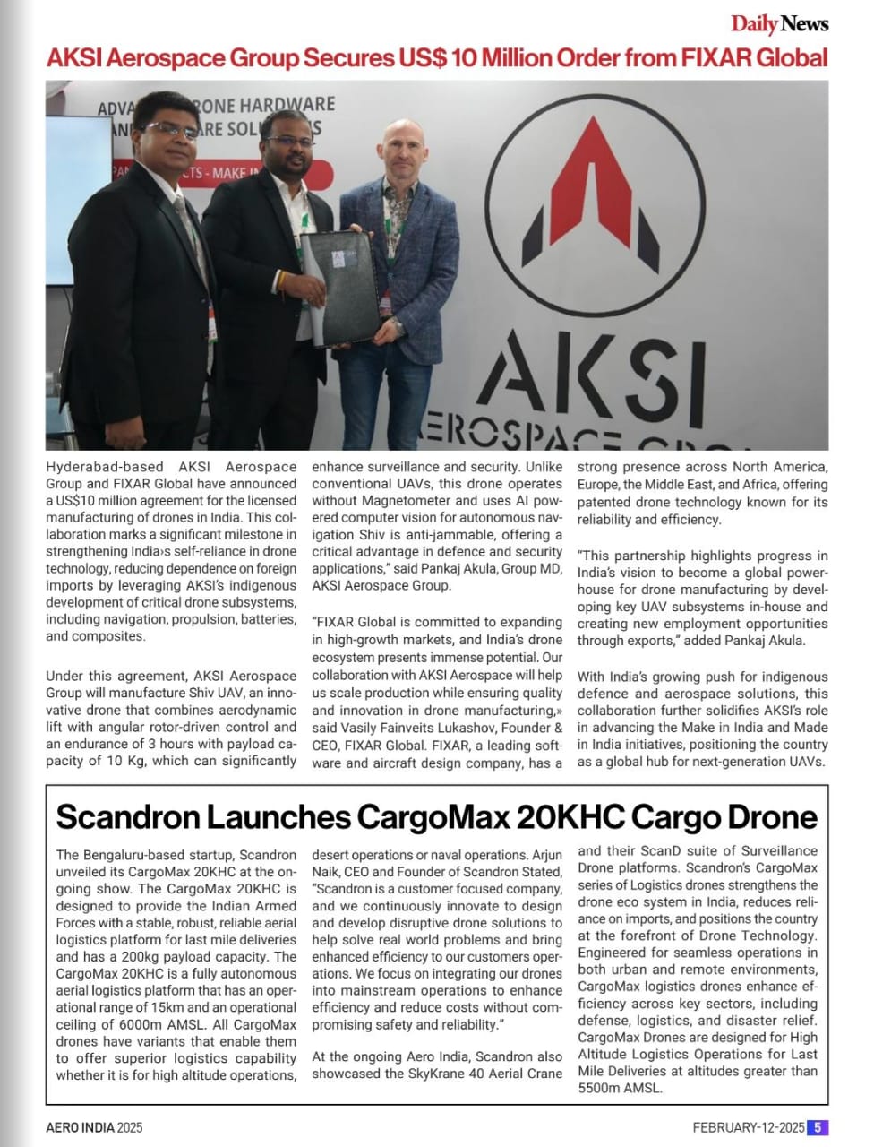 A strategic partnership was announced between AKSI Aerospace Group and FIXAR Global for licensed drone manufacturing in India.